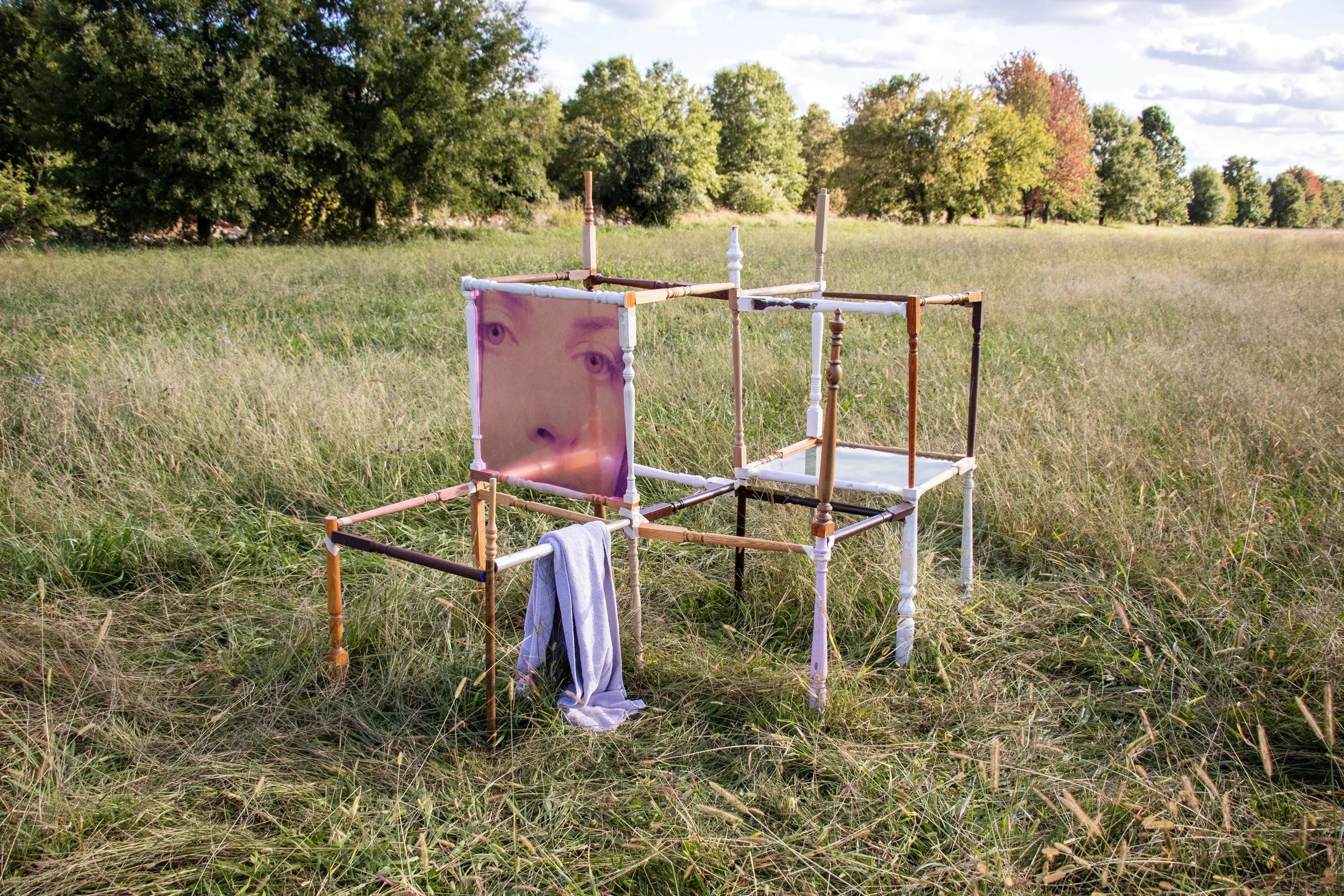 Portrait of American Gothic, 2023, staircase banisters, plexiglass, towel